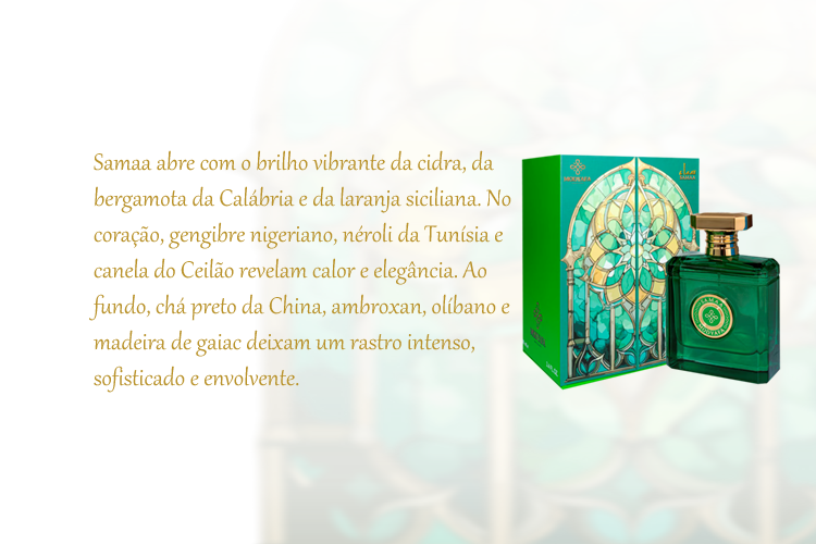 Visualização rápida Samaa Notas de Saída: Cidra, bergamota da Calábria e laranja siciliana. Notas de Coração: Gengibre nigeriano, néroli da Tunísia, e canela do Ceilão. Notas de Fundo: Chá preto da China, ambroxan, incenso de olíbano, (frâncincenso) e madeira de gaiac.