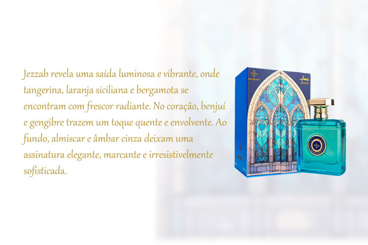 Visualização rápida Jezzab Notas de Saída: Tangerina, laranja siciliana, bergamota. Notas de Coração: Benjuí, gengibre. Notas de Fundo: Almíscar e âmbar cinza.